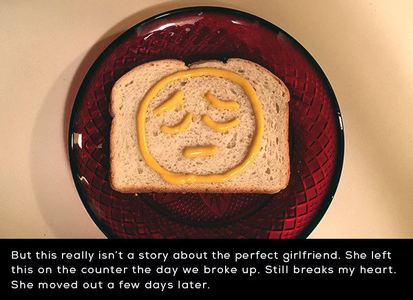The problem I have is that the face on the bread is an emoji. Who the hell would use an emoji to express intense heartbreak?