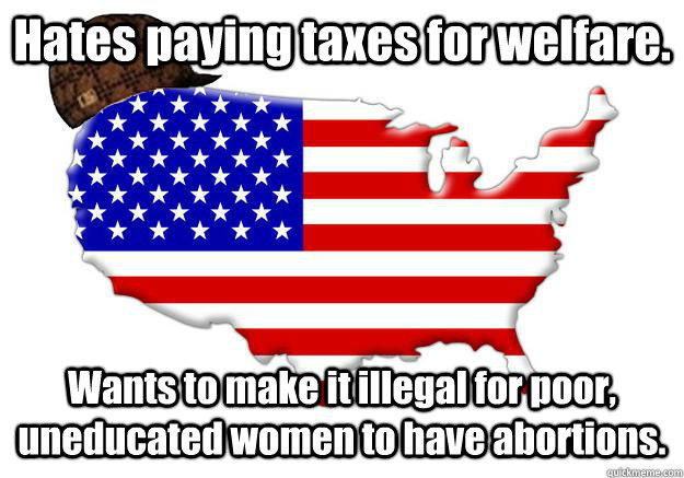 Doesn't want to support some woman's six kids with tax money while she doesn't work, but also doesn't want her to kill them. Really not that hard to reconcile. Condoms and birth control are a hell of a lot cheaper than abortions, so why can't women who get abortions have used them instead? It's more like, "doesn't want to tolerate what some view as murder, but also doesn't want to pay thousands for someone else's stupidity and irresponsible behavior."