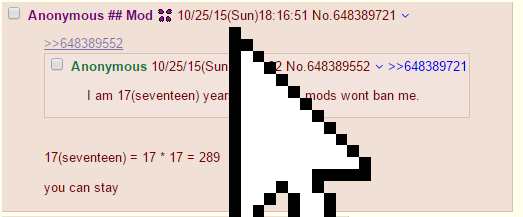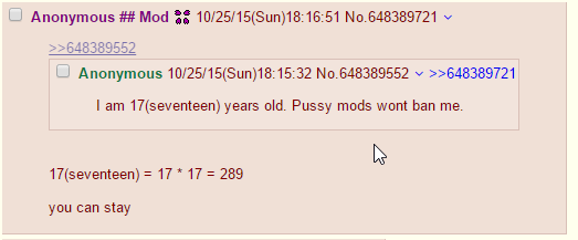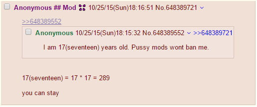 You have to be 18 or older to access some boards. Anon tried to get banned by saying that he is only 17, or, as he put it 17 (seventeen), which can be seen as a multiplication, 17 * 17, which equals 289.