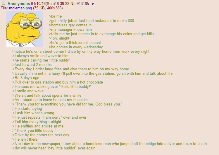 Ussually if i' m not in a hurry i' ll pull over into the gas station, go sit with him and talk about life