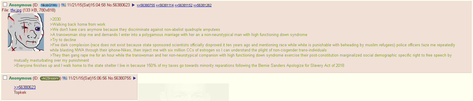 Tags: 2030 | future | Transgender | Gay | faggot | berniesanders | greentext | slavery | racism | 4Chan