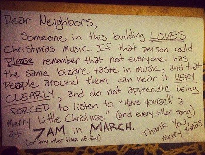 The first one says "dear neighbors" to indicate that perhaps they don't know exactly who it is. How do you confront someone when you don't know who they are?