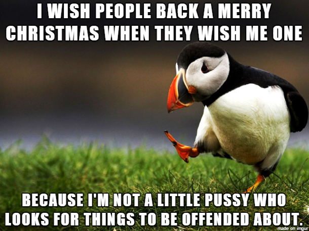 Seriously though, I have never in my entire life had anyone get upset or offended when I said "Merry christmas" in the store or as a passing. Where on earth do you live where people actually get offended by it?