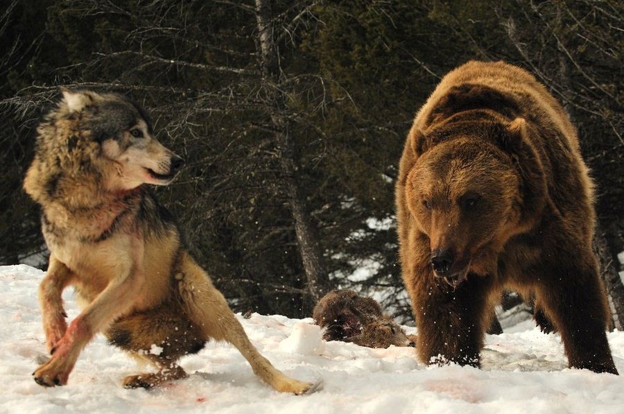 Brawl between a wolf (canis lupus) and a grizzly bear (ursus arctos horribilis)