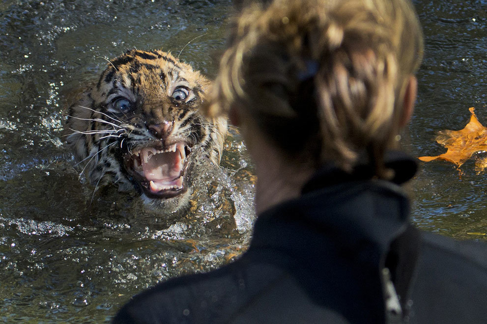 A three-month-old Sumatran tiger cub named Bandar reacts after being dunked in the tiger exhibit moat for a swimming test at the National Zoo in Washington, D.C. All cubs born at the zoo must take a swim test before being allowed to roam in the exhibit. Bandar passed his test.