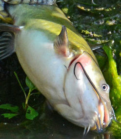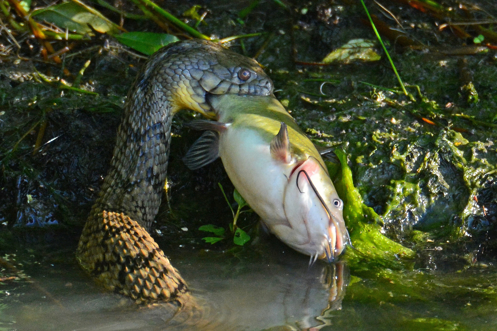A bullhead catfish caught by a diamondback water snake