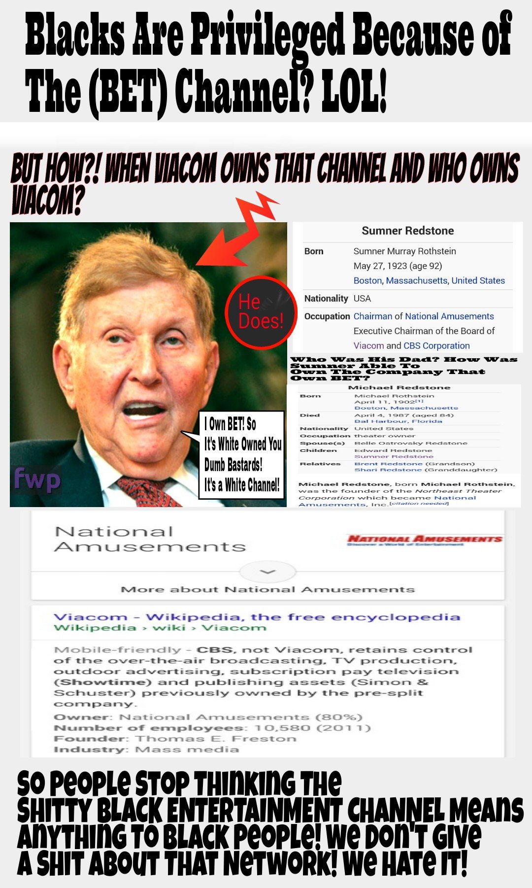 Consider this though, there is no White Entertainment Television (WET) also no Hispanic (HET) Latino (LET) or any other such racially correlating entertainment television network. Draw your own conclusions from that all you want, I'm just pointing it out.