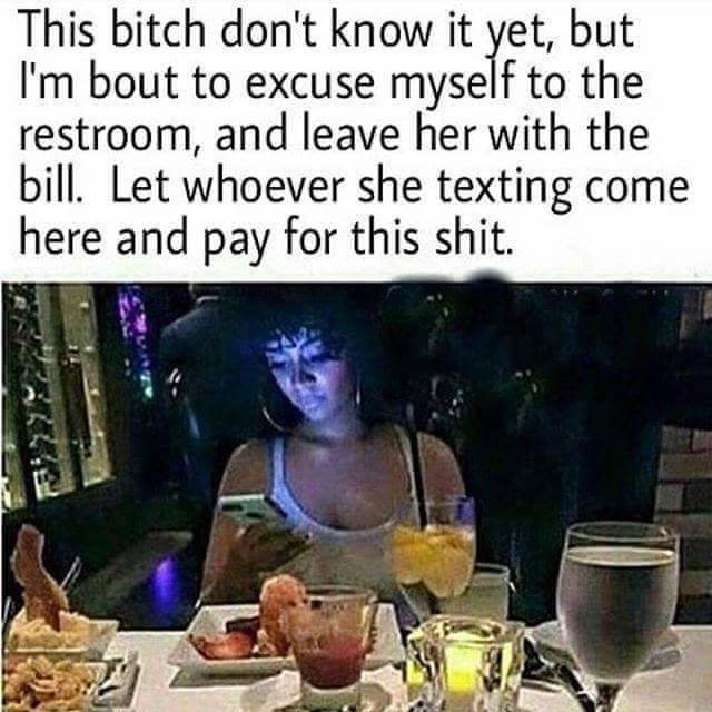 That and she came for free food. We've got all this social tradition about how the man has to do everything for the woman, then they go around hollering their heads off about how they don't need no man and are better than men. But sure don't mind preying on the expectations that they'll get free **** for stringing one along until someone better-looking with more money shows up.