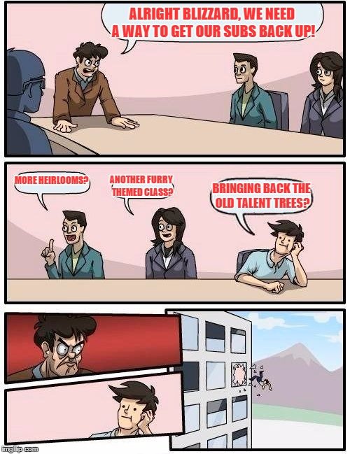 Not to mention that rewarding level-ups won't really affect subs. If they want subs they need content. There's apparently nothing planned between now and Legion, which while actually pretty standard for WoW There's always been a long period of time between final patch of expansion and pre-patch of the next , is retarded.