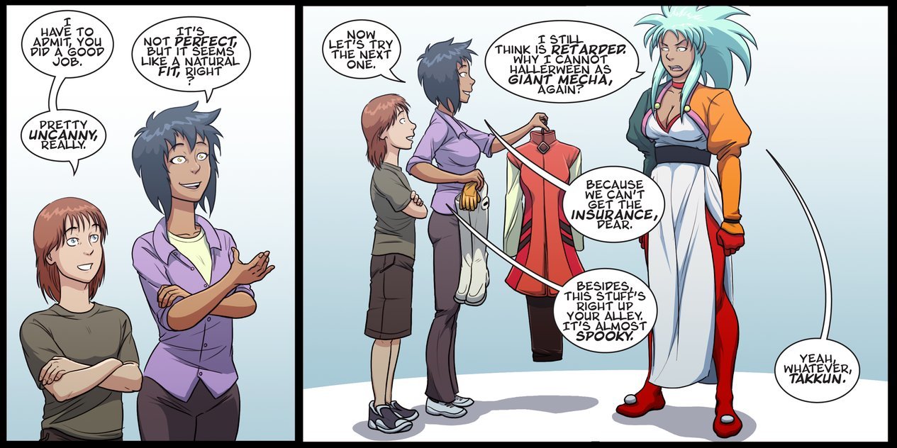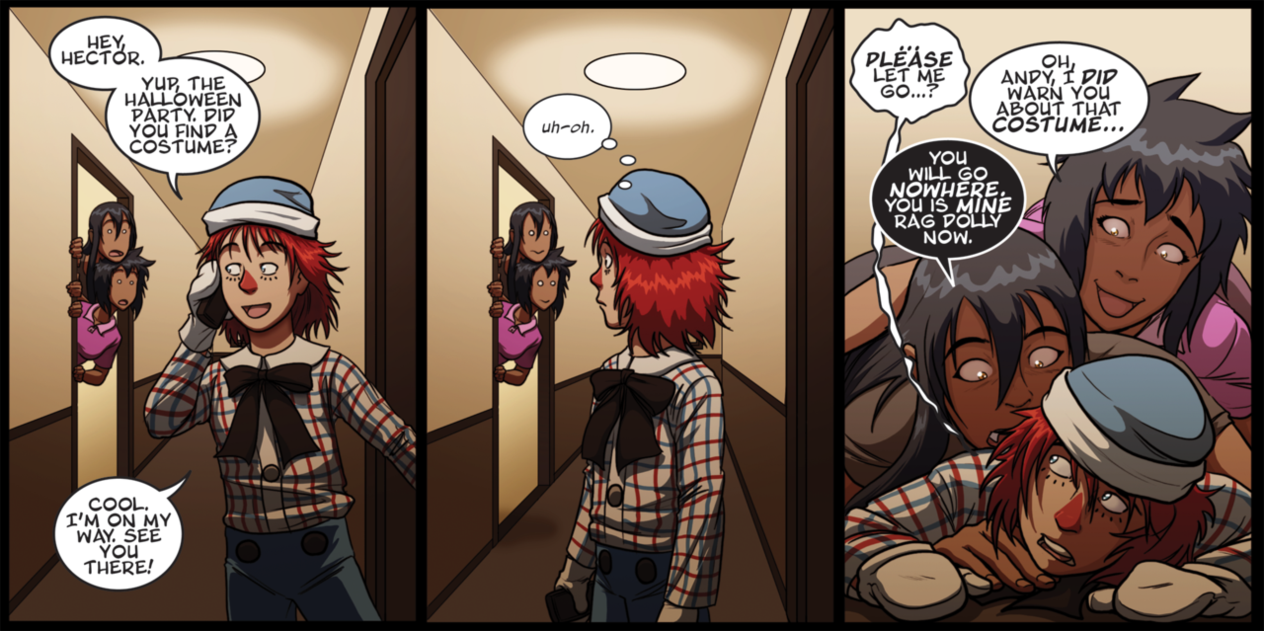 As far as these comics go, if you hadn't figured it out already, Gogo's maybe only weakness seems to be cute things. And for all you plebs who didn't have a good childhood, Andy's dressed up as a Raggedy Andy doll. Let's hope he makes it to the party in one piece, eh? I have no idea who they're dressing Gogo up as in the first comic, though. My weeb levels must be too low.