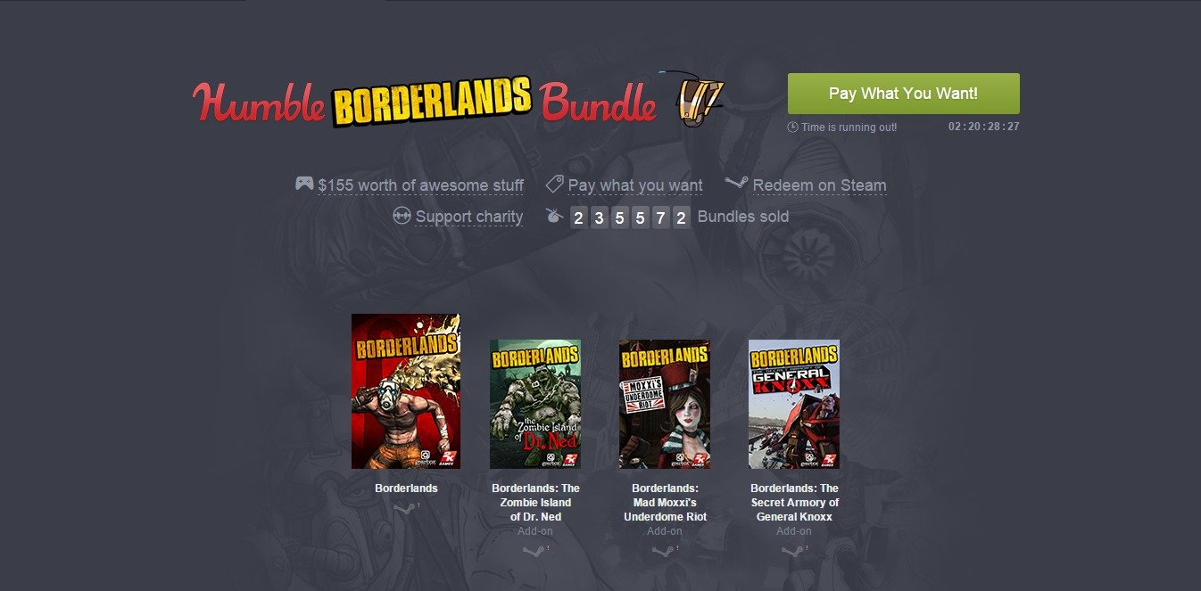 Humble Bundle is having another charity give away event. This time you can get Both Border Lands 1 and 2 plus an ass load of DLC for less than $8. mrbator posted that he was going to be giving away a copy from here (/Giveaway/funny-pictures/5604173/), so I thought I'd go ahead and let FJ know that they can buy all of this stuff themselves for an uberly low price.