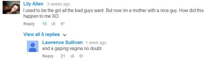 This image depicts a comment on a video of Bowling For Soups' "Girl All The Bad Guys Want". The first commenter attempted to express how her own life was relevant to the video in question. The second responded by insinuating that the first has a history of promiscuity by claiming that the first commenter's probability of having a gaping vagina was relatively high.