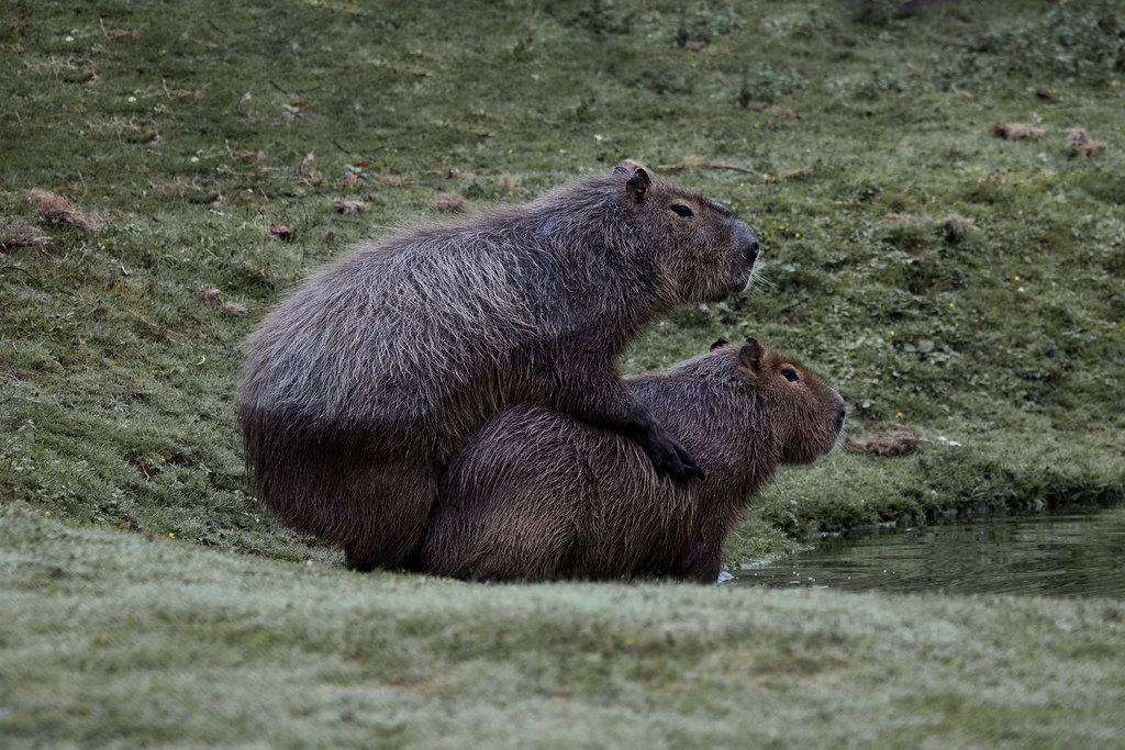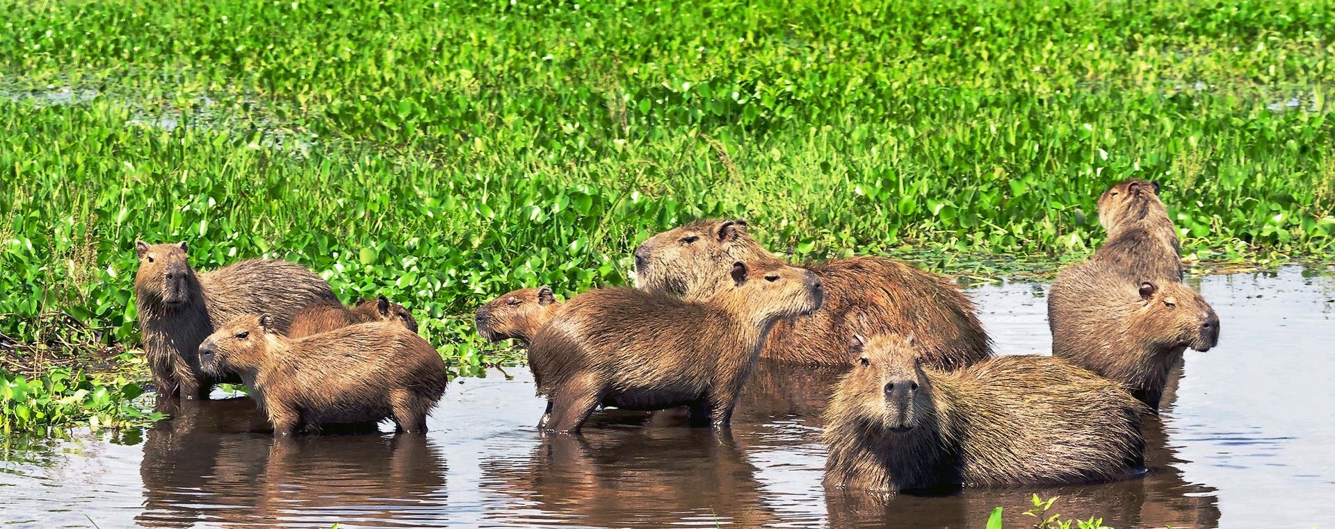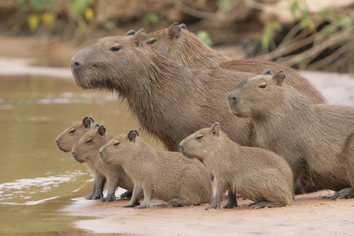 The capybara eats about 3 kg’s of grass a day. During the wet season, when there is plentiful of food, they are more selective, getting 4/5 of their daily intake of food from only 5 grasses. Besides grasses, they will also eat aquatic plants. Particularly when less food is available, they will also eat cultivated land making them an enemy of local agriculturists who will sometimes hunt them.