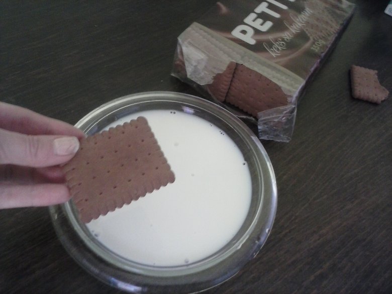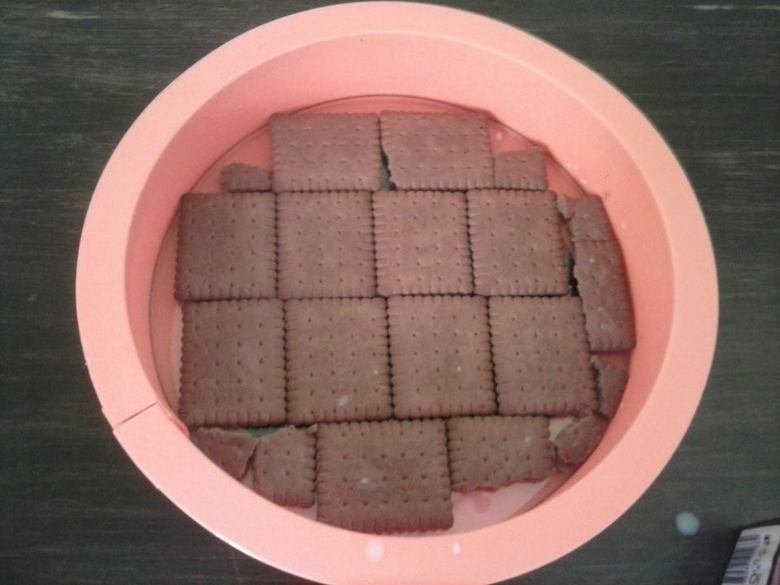 Now it the time to start building the cake. Take the cookies and dip em in milk on both sides, then use all that TETRIS experience you have been collecting since childhhood and cover the bottom of your cake pan