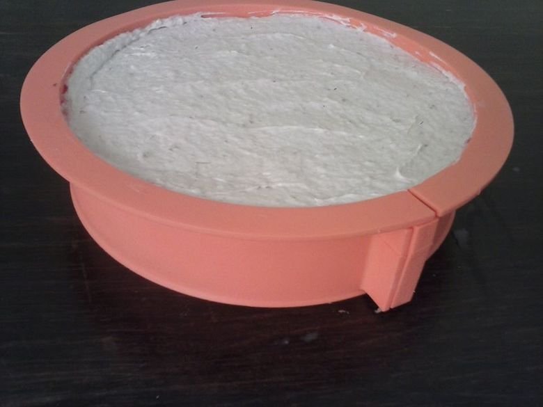 And POW! There it is, your banana cake is almost done. All you have to do now is: Let it chill. Put it in the fridge for at least 4 hours before removing the mold cuz it needs some time to "gather its thoughts" after having its brain so smashed