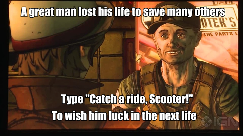 Scooter, a character from the Borderlands games dies in TellTale's "Tales from the Borderlands" advenutre game. "Catch a ride!" was his catchphrase and the name of his "company"