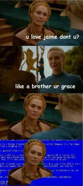 Cerci blue screen Flag iwishfd (See more...) next random - Fav Favorite Comment ✖ Top NextComment next Tags: game of thrones | Got | funny | lol | burn | rekt u love. jaime dont u? r ‘I II III ... +6 Views: 1337 Favorited: 0 Submitted: 04/29/2015 Share On Facebook -Favorite +Favorite Unsub from iwishfd Subscribe to iwishfd