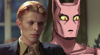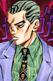 This character is from Jojo's Bizarre Adventure, wherein almost every power and attack is a musical reference. This is Kira, whose stand, Killer Queen, develops an attack called Bites the Dust to blow up people who try to figure out his identity.