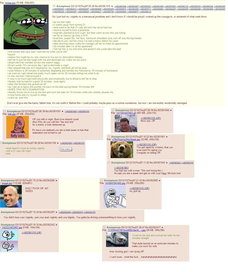 So Must lost my virginity to a transexual prostitute and I don' t know if I should be proud I worked up the courage to, or ashamed of what went down