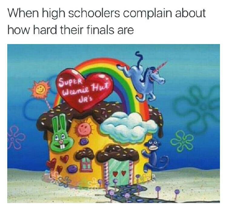 I thought finals in high school were harder. I wasn't nearly as good at taking exams back then, I had more classes, and the content was spread out over more time. I have trimesters, so it's 3 courses over 10 weeks.