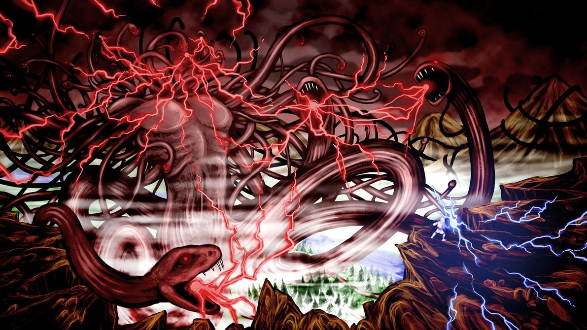 The greatest monster in greek mythology. Typhon was the last son of Gaia and Tartarus, born with the purpose of punishing Zeus for defeating the titans. Typhon was described as having a human torso with numerous vipers instead of legs, a hundred dragon heads (or a human one, with sepents as fingers), wings all over his body, and was as tall as the sky itself, his arms reaching east and west. He also had storm powers, making him a storm deity.
