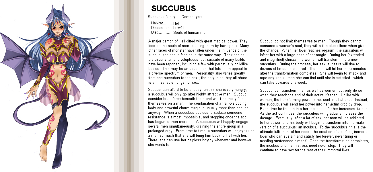 A demon based completely on the sin of lust, the succubus is a female demon said to be so beautiful only the strongest of will could resist her seductive skills. Older stories though, depict her as quite demonic and horrific, but she could take on the form of a beautiful human female in order to seduce her victims.