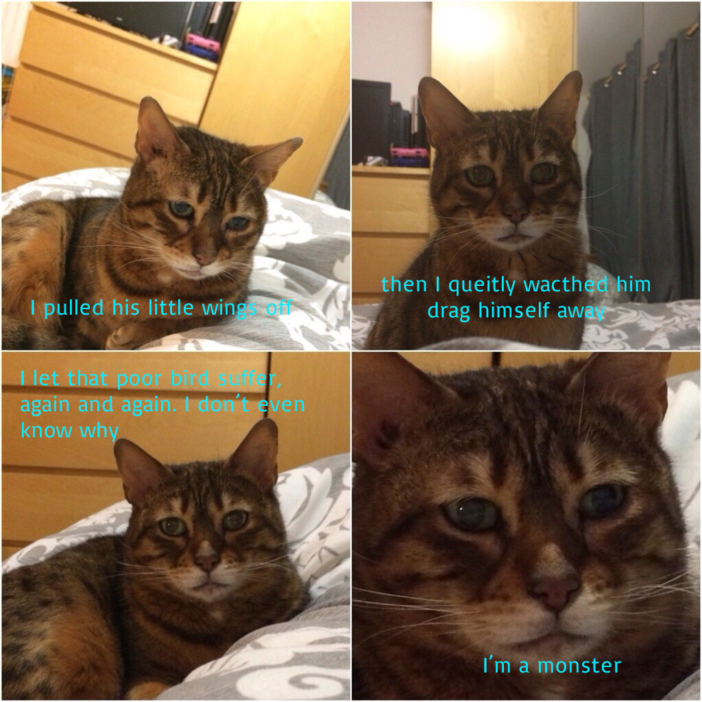 Content for your eyes to do the reading. Flag muffincannibal (See more...) prev next random - Fav Favorite Comment ✖ PrevTop NextComment (Enlarge) prev next Tags: cat | Psychopath | sad | Selfawareness | Cute I pulled his little winar . ' - then I queing him drag himself ‘ again and again. know why I' m a monster ... +21 Views: 3164 Favorited: 1 Submitted: 12/27/2015 Share On Facebook -Favorite +Favorite Unsub from muffincannibal Subscribe to muffincannibal