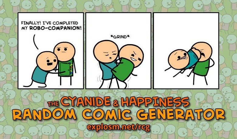 Cyanide and Happiness Flag spoodermanz (See more...) next random - Fav Favorite Comment ✖ Top NextComment (Enlarge) Cyanide and Happiness just released this random comic generator and here are some I got that I quite liked. Enjoy! Link: You need to login to view this link next Tags: Cyanide | and | Happiness | Cyanide and Happ | random | generator | comic | banned | oops +9 Views: 1777 Favorited: 2 Submitted: 01/20/2015 Share On Facebook -Favorite +Favorite Unsub from spoodermanz Subscribe to spoodermanz