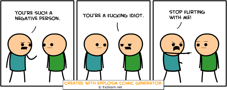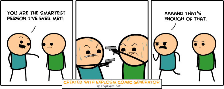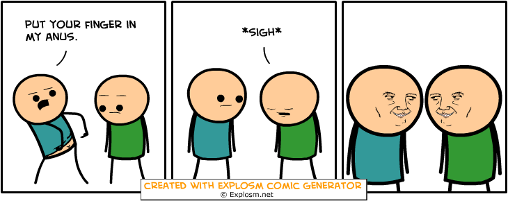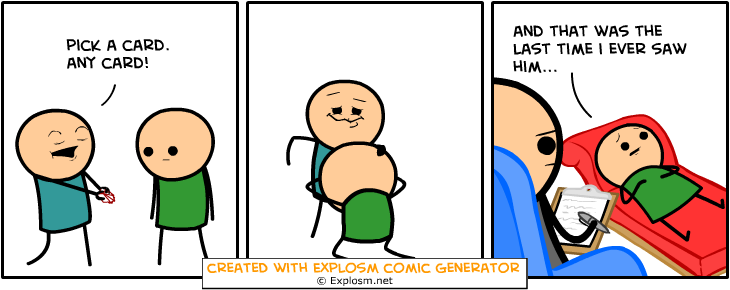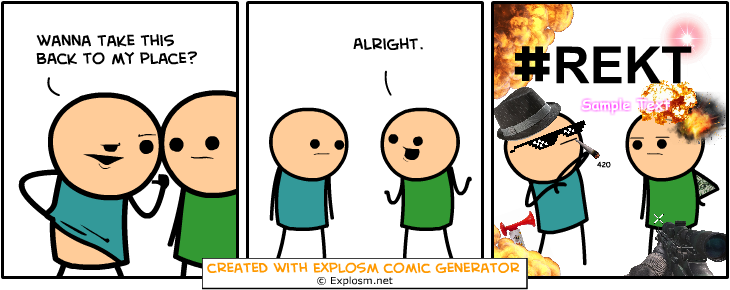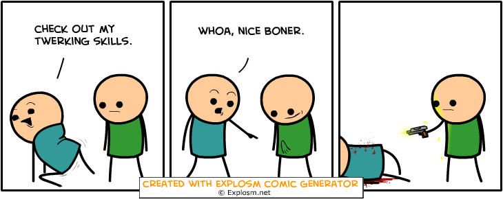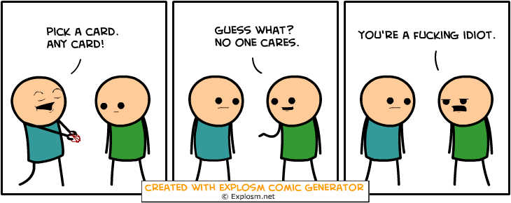Cyanide&Happiness Comic Gen. Part 4/10 Flag trollzman (See more...) prev next random - Fav Favorite Comment ✖ PrevTop NextComment Some Cyanide & Happiness Randomly Generated Comics That Made Me Giggle explosm.net/rcg Links To Previous: Part 1: /Cyanide+happiness+comic+gen+part+1/funny-pictures/5779885/ Part 2: /Cyanide+happiness+comic+gen+part+2+10/funny-pictures/5780808/ Part 3: /Cyanide+happiness+comic+gen+part+3+10/funny-pictures/5781767 prev next Tags: Cyanide | Happiness | comics | funny +5 Views: 1503 Favorited: 0 Submitted: 12/28/2015 Share On Facebook -Favorite +Favorite Unsub from trollzman Subscribe to trollzman