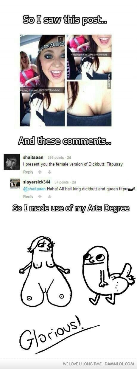 Dickbutts body is a dick, with another dick attached to it... Titpussy's body is tits, with another set of tits attached to it... see where it's going?