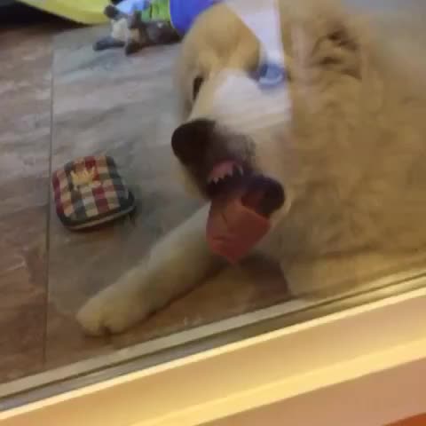 Pretty sure that's a great pyrenees, they monsters when they're full grown. Looked around for one myself, the pups at 3 weeks are bigger than full grown yorkie and the male looked like a white lion. Pretty awesome breed, but they're almost exclusively outdoor dogs since they grow so big. Pics not mine