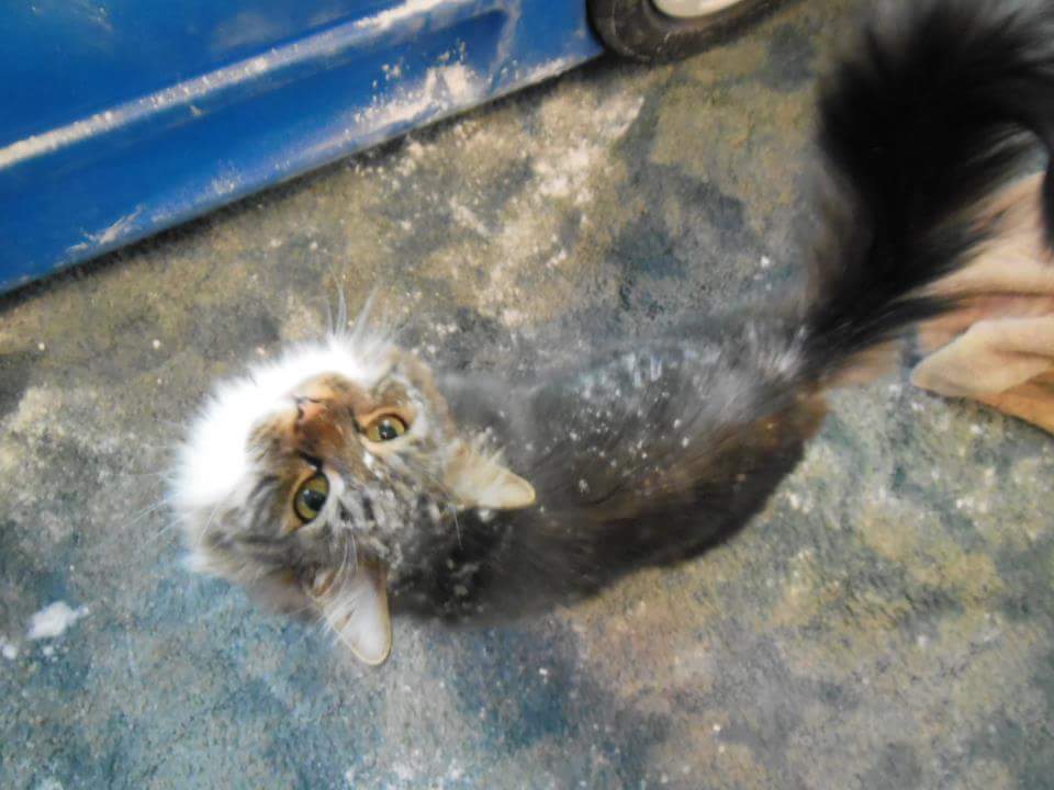 Caboose has also tripped going up or down stairs,run into closed doors,or windows,fallen off stuff or just about anything he can do. This pic is a few years old,but it's from when my son got into his moms flour.