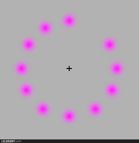 I think my blind spot is also coming into play on this on ass I also see the illusion of the "green" dot eating up all the pink dots and after eating them all spewing them back out as it goes around