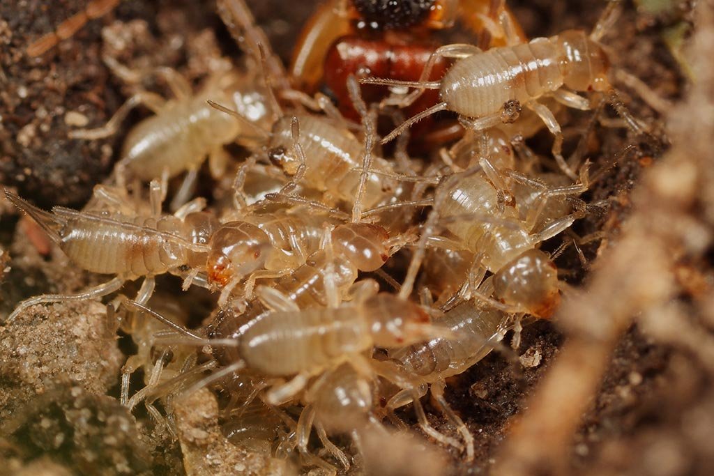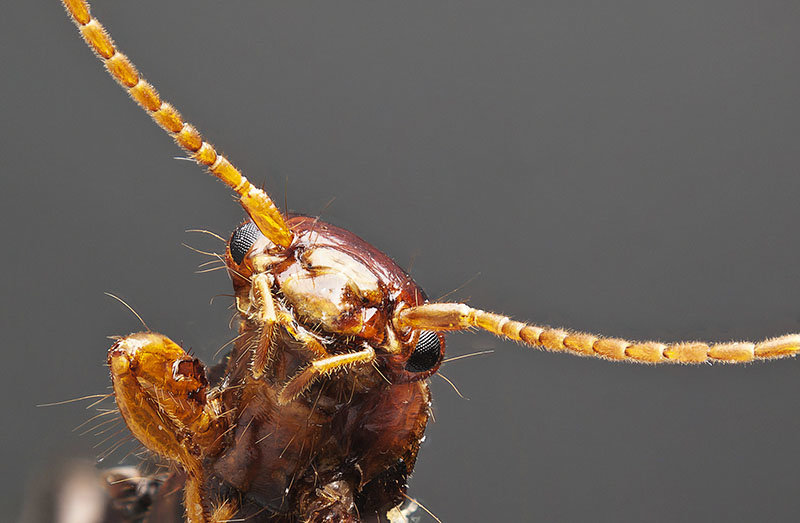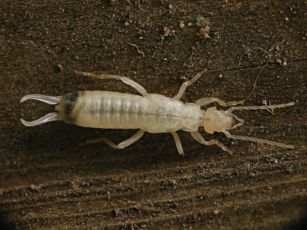 Most earwigs are nocturnal and inhabit small crevices, living in small amounts of debris, in various forms such as bark and fallen logs. Species have been found to be blind and living in caves, or cavernicolous; reported to be found on the island of Hawaii and in South Africa. Food typically consist of a wide array of living and dead plant and animal matter. For protection from predators, the species Doru taeniatum of earwigs can squirt foul-smelling yellow liquid in the form of jets from scent glands on the dorsal side of the third and fourth abdominal segment. It aims the discharges by revolving the abdomen, a maneuver that enables it simultaneously to use its pincers in defense.