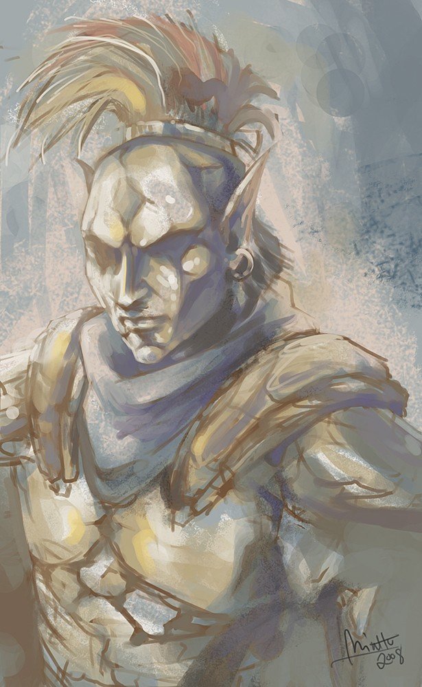 An unnamed Dwemer. His helmet reads, as far as I can decipher: "LOREX BOII?" Some of these runes are best guess, as the artist hasn't been very clear with them. Despite the common parlance name for the Dwemer being Dwarves, it is probable that they were about the same height as the other Elven clans. They also, as depicted, almost certainly looked much the same as the other Aldmeri offshoot peoples, as no major magical event had occurred to change them drastically. The beards, for example, are more a cultural affectation than a genetic predisposition.