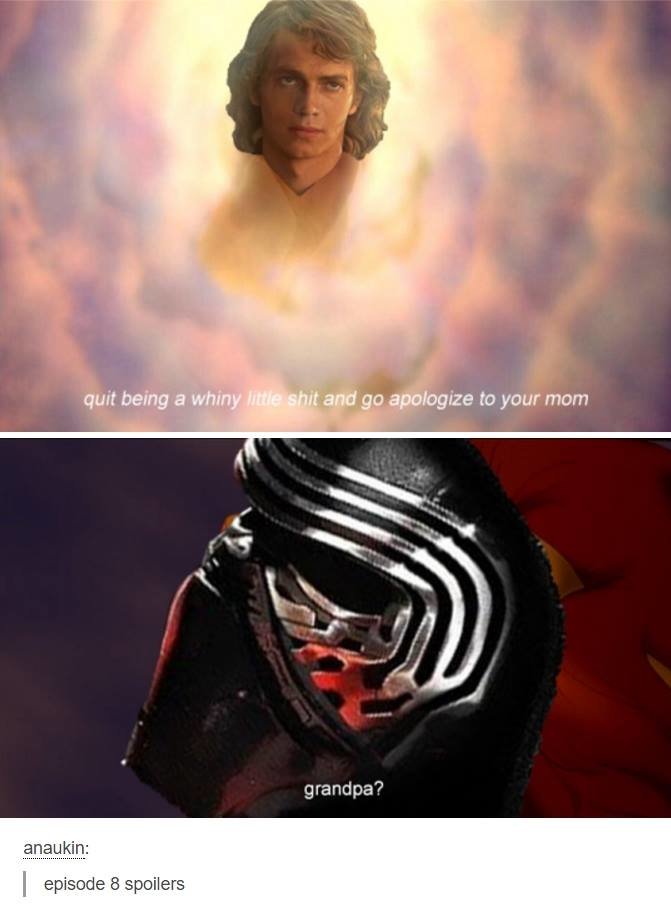 That first line I expect to happen in 8. If that second line happens, I'm gonna be a little upset...I personally didn't mind the ANH similarities in TFA, they weren't that important to the character-based story, but if they do the same thing for the next two that would be pretty upsetting. Luckily, Lawrence Kasdan has stated that Rian Johnson's script for 8 is "weird". I don't know what that means specifically, but ESB isn't really "weird", so that's good.
