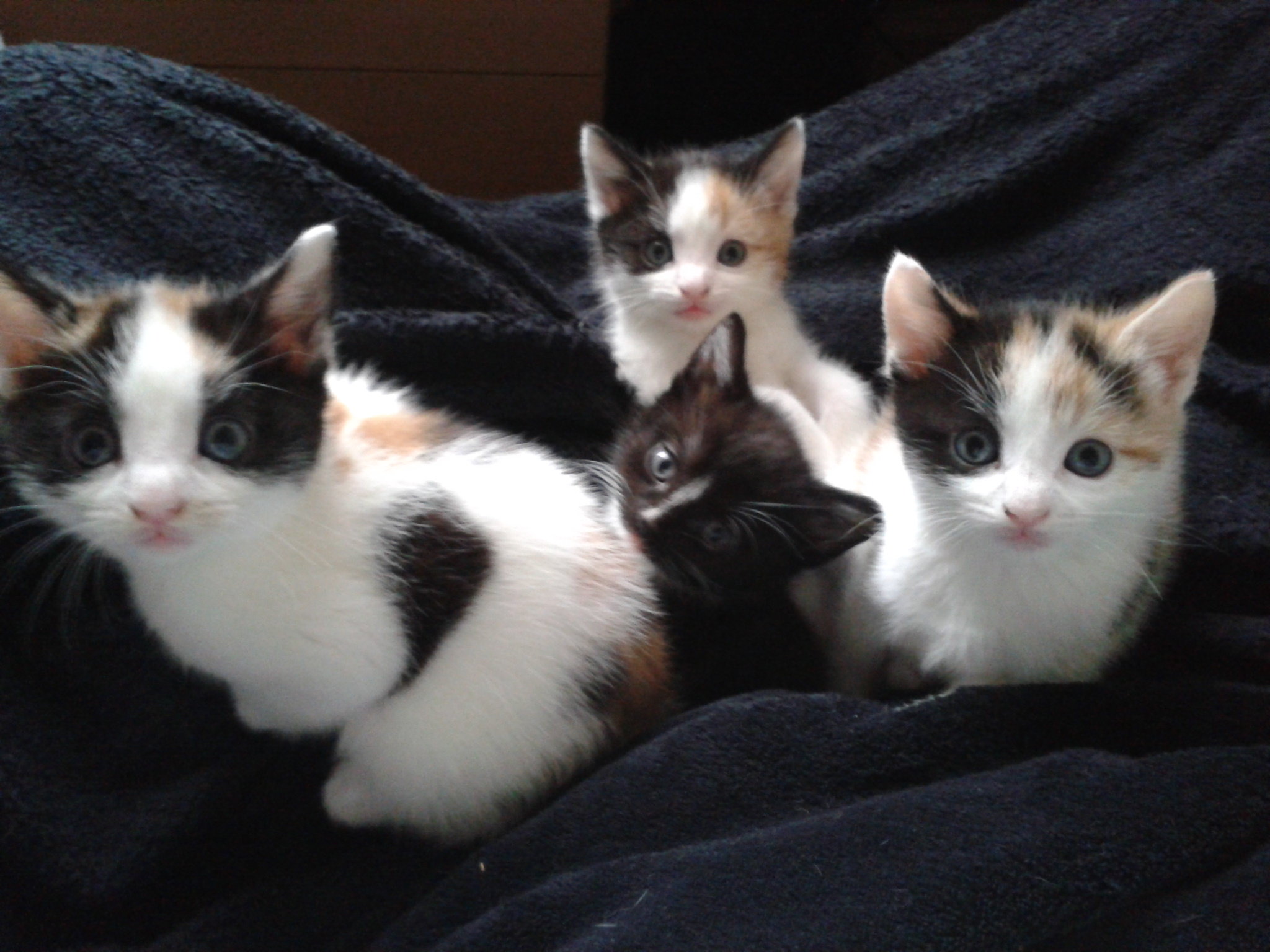 The three tortoise shells are female, and the black with white socks and chest is a male