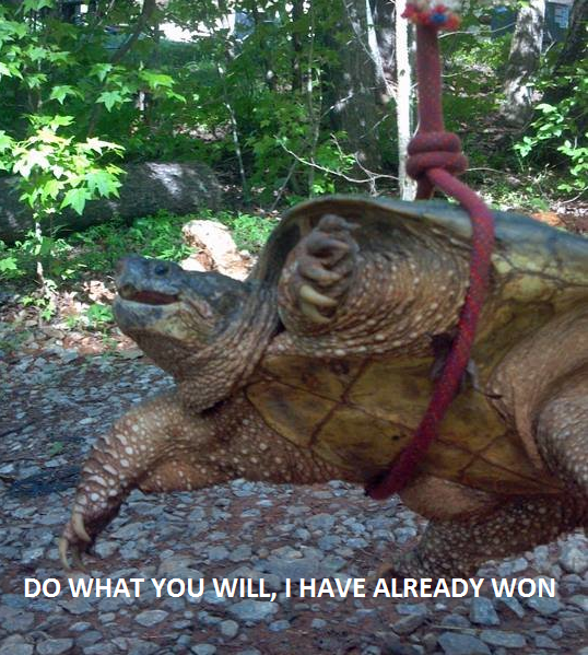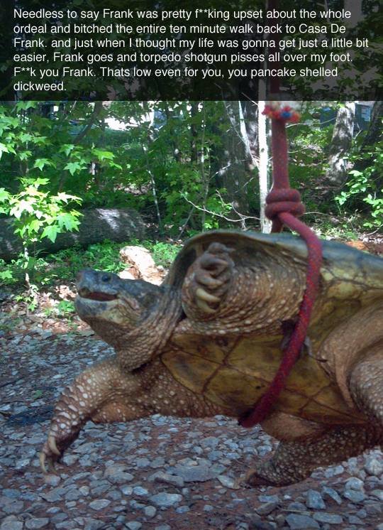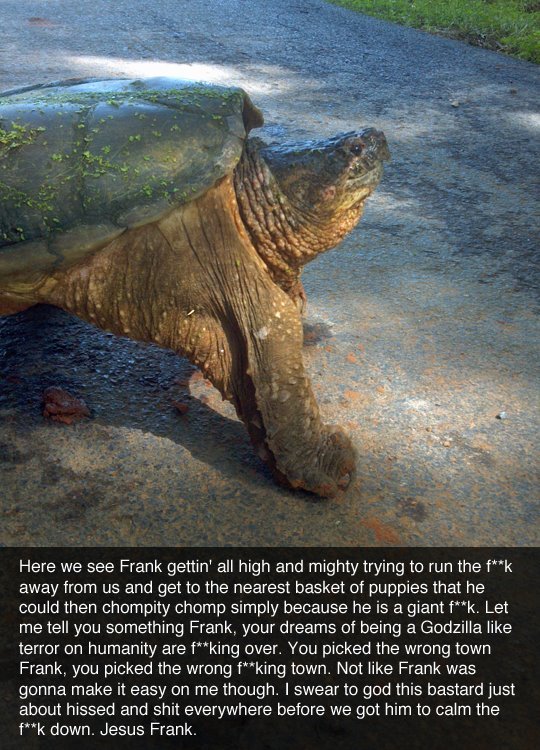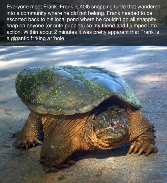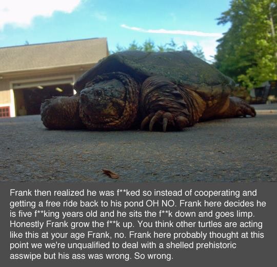 I was swimming in a lake in ontario once, paddling towards the dock. Two meters out I realize there was a 2 foot wide snapper RIGHT IN FRONT OF ME. My mother and all of my relatives proceeded to point and laugh as I tried to get the hell out of their, the goddamn turtle on my heels, and my brother laughing and scooting away on the paddle boat.