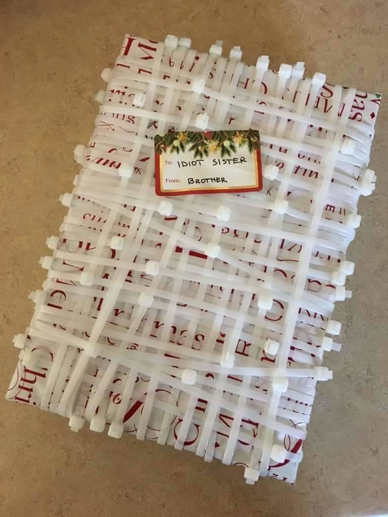 It reminds me of the picture set where the guy went to ridiculous lengths to prevent someone from opening a gift, because he got salty that he lost a bet.