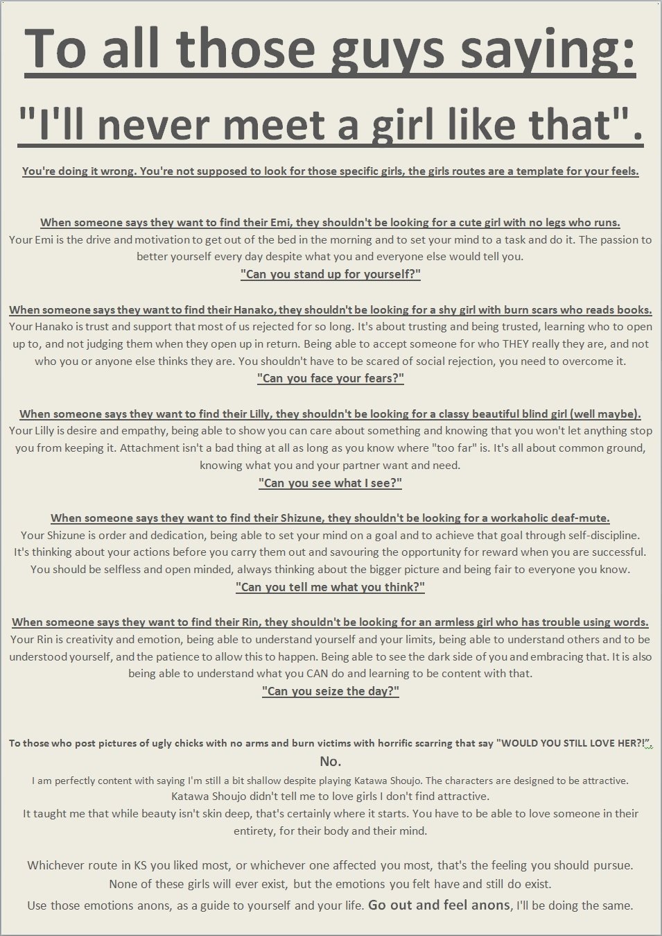 Felt Like Sharing this Gem Flag melllvinnn (See more...) next random - Fav Favorite Comment ✖ Top NextComment Worth the read if you have played Katawa Shoujo and afterwards had an existential crisis. (Enlarge) next Tags: feels +6 Views: 1613 Favorited: 0 Submitted: 02/23/2015 Share On Facebook -Favorite +Favorite Unsub from melllvinnn Subscribe to melllvinnn
