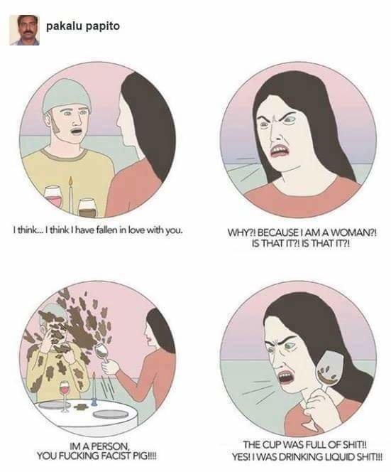I mean for ***** sake, open your eyes. What do you see here on this page? A post that shows us the most vile feminists I've ever seen, cherry picked for our viewing. Then we thumb it up so everyone else can see and we rage. Just build up this rage at something going on across the globe and keep it pent up while it we let it skew our opinion. It starts with "that mob", then it's