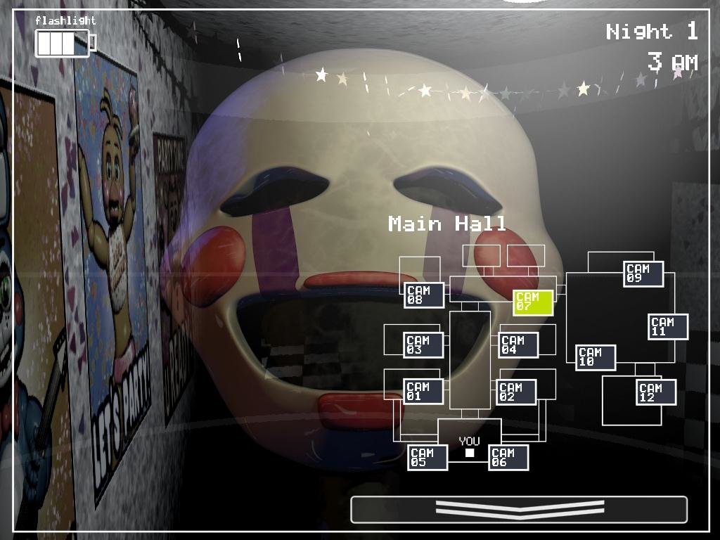 If the marionette is released in FNaF 2, it's possible to see his face flicker in the cameras while you wait for his jump scare. This further backs up the theory that FNaF 2 takes place in a dream as when terror strikes, dreams become more finnicky and unstable (at least in my experience).