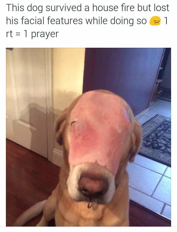 you know what...i work at hospitals...i see the real burn victims..and i cannot even begin to express the lump this puts in my throat.. go on have your laughs and pretend its funny to compare burn scars to a piece ham because a golden retriever is involved...but know this, somewhere out there is a little girl or a little boy...or hell a grow ass adult whose face is irrepressibly damaged with burn scars, and they are dying inside when they see this...and no not from laughter because i know at least one of you sick retards wouldve said that...they are experiencing shame on a level you hopefully will never know... enjoy the green thumbs u ****** monster..i hope they fill that giant void inside of you where your soul should be