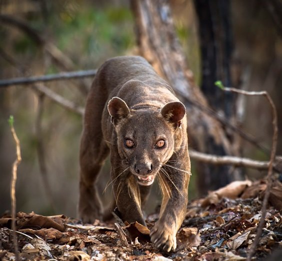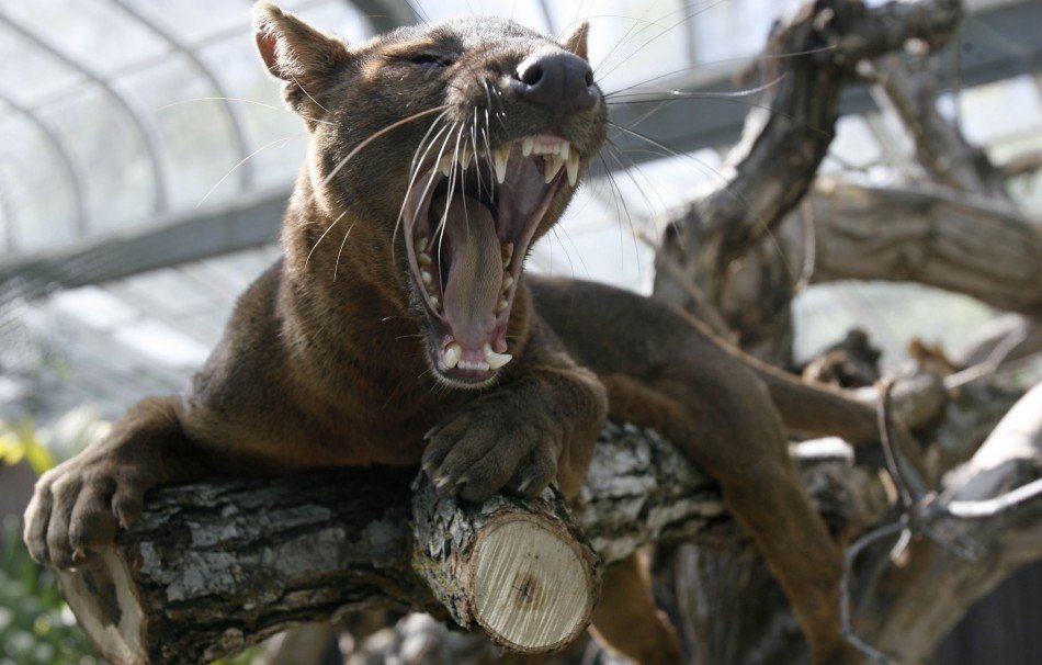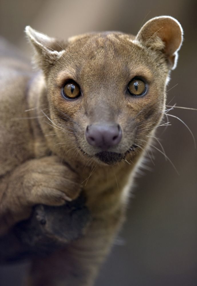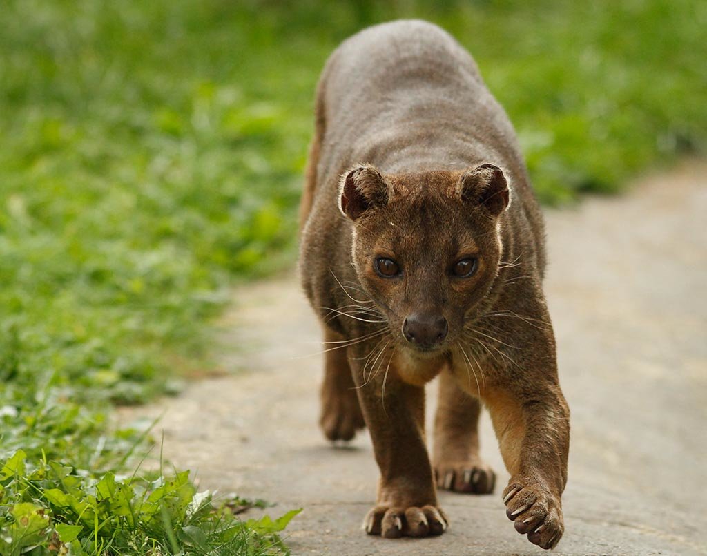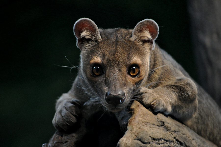 A relative of the mongoose, the fossa is unique to the forests of Madagascar, an African island in the Indian Ocean. Growing up to 6 feet (1.8 meters) long from nose to tail tip, and weighing up to 26 pounds (12 kilograms), the fossa is a slender-bodied catlike creature with little resemblance to its mongoose cousins. It is the largest carnivore and top predator native to Madagascar and is known to feed on lemurs and most other creatures it can get its claws on, from wild pigs to mice. Unlike mongooses, and more like felines, the fossa has retractable claws and fearsome catlike teeth. Its coat is reddish brown and its muzzle resembles that of a dog.