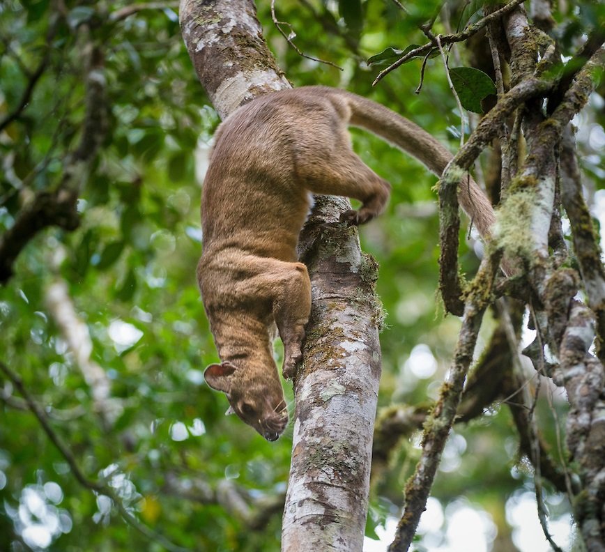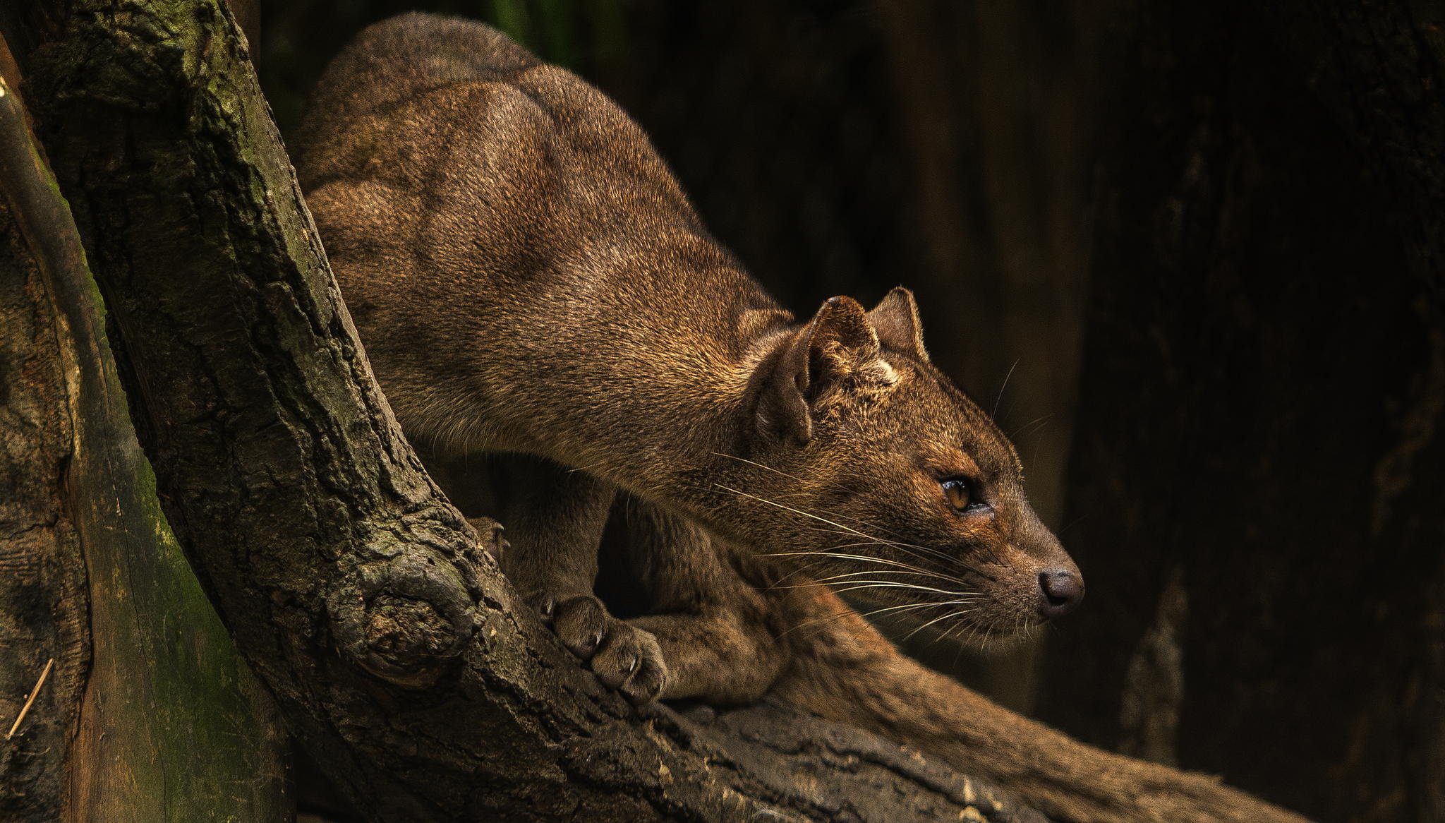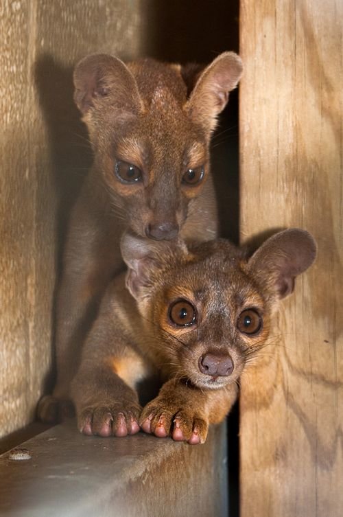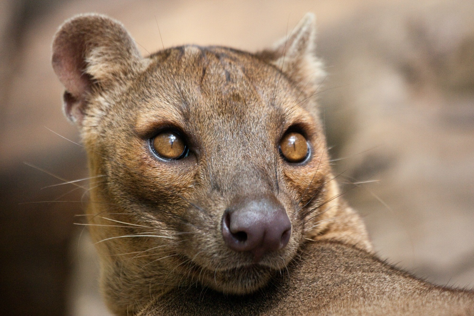A relative of the mongoose, the fossa is unique to the forests of Madagascar, an African island in the Indian Ocean. Growing up to 6 feet (1.8 meters) long from nose to tail tip, and weighing up to 26 pounds (12 kilograms), the fossa is a slender-bodied catlike creature with little resemblance to its mongoose cousins. It is the largest carnivore and top predator native to Madagascar and is known to feed on lemurs and most other creatures it can get its claws on, from wild pigs to mice. Unlike mongooses, and more like felines, the fossa has retractable claws and fearsome catlike teeth. Its coat is reddish brown and its muzzle resembles that of a dog.