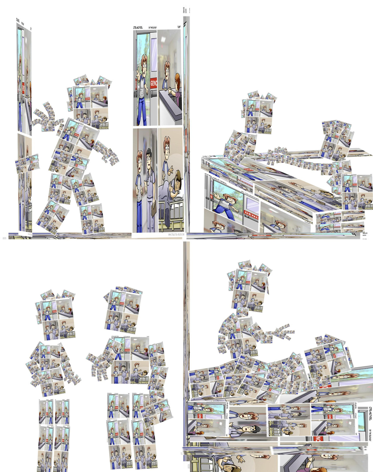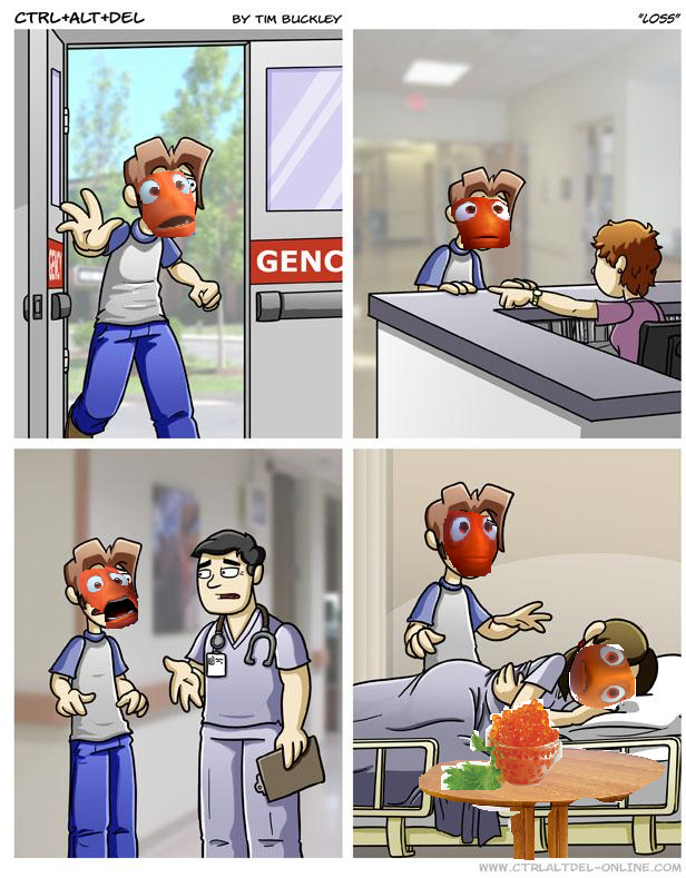 There's a miscarriage bit from CTRL+ALT+DELETE and the symbols are a + that breaks up the four panels. In the top left is a panel where it's the husband coming into the hospital. Then on the top right it's him next to the receptionist. Bottom left is him next to the doctor. Then the bottom right is him next to his wife, laying down and depressed she lost her child. Each person in each scene is represented by a line.