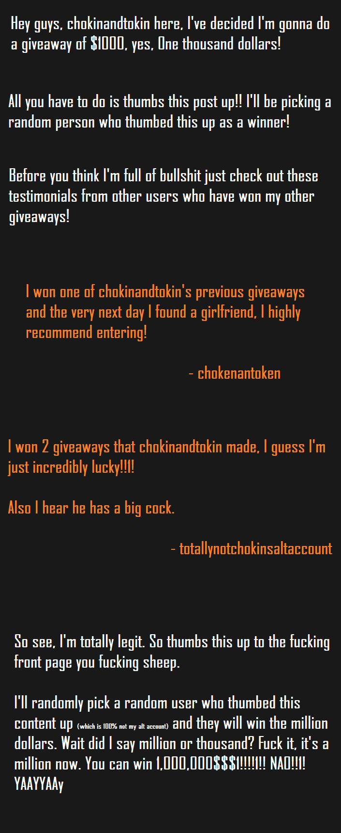 Since you upped the pot to 1 million, how about you give $1,000 to a 1000 users instead of 1,000,000 to 1 user.