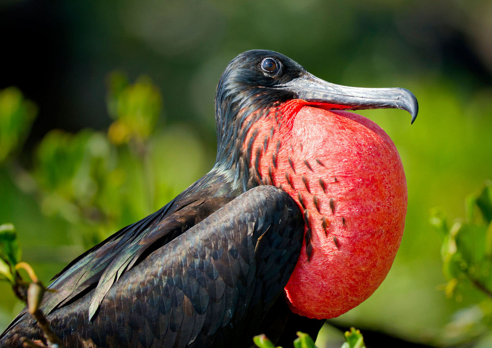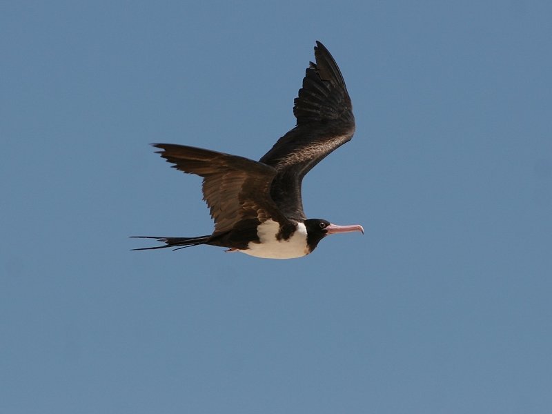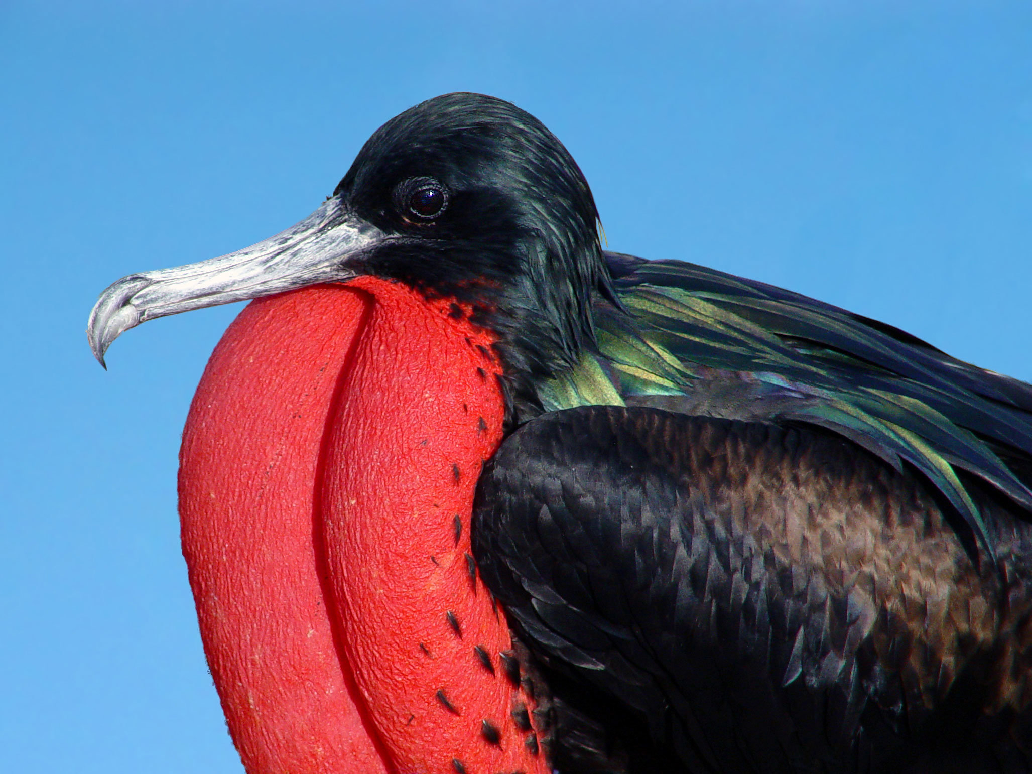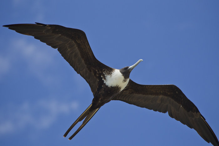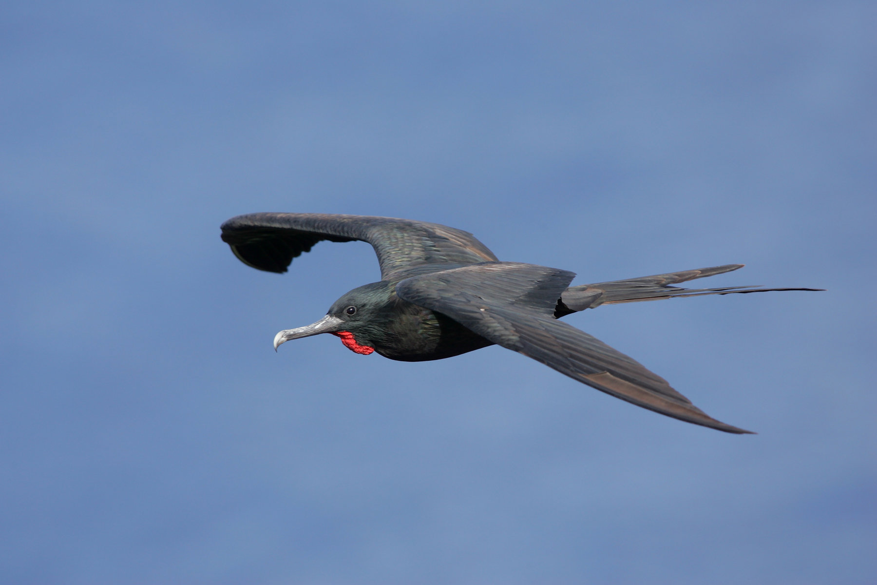 The frigatebird is a large species of sea-bird that has an enormous wingspan that often exceeds two meters in length. Male frigatebirds are most commonly known for their red throat pouch, which are inflated to attract female frigatebirds during the mating season. Frigatebirds are generally black in colour although some frigatebirds look slightly browner than black. Outside of the mating season, male frigatebirds and female frigatebirds can be easily identified due to the fact that the female frigatebird has a white patch on her underside.
