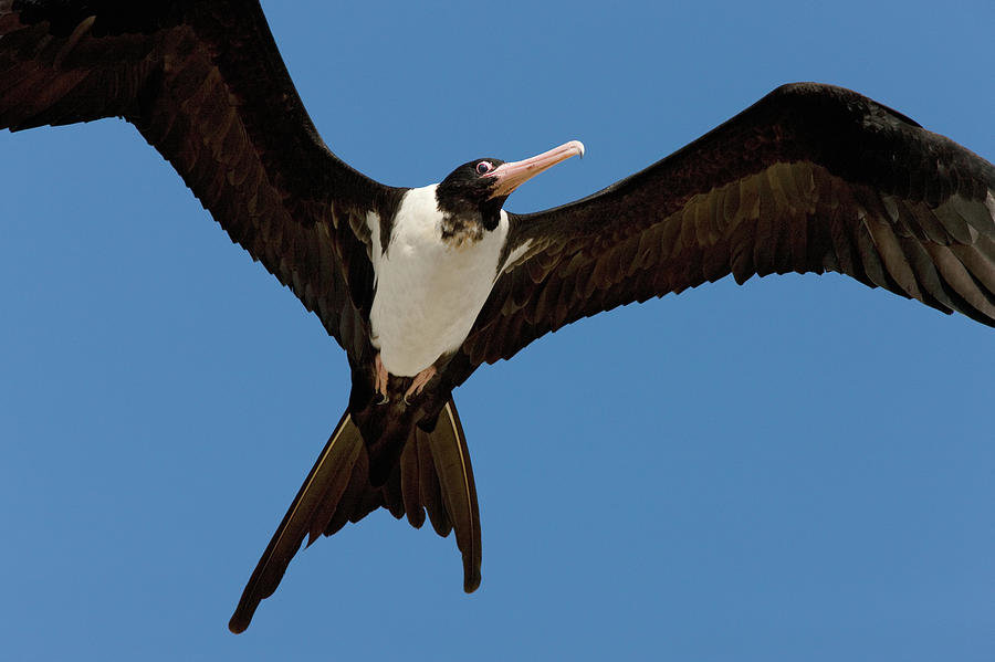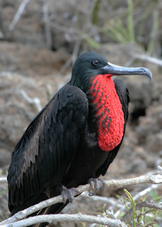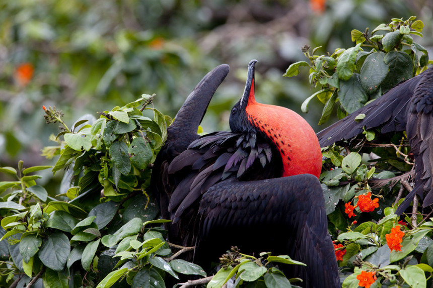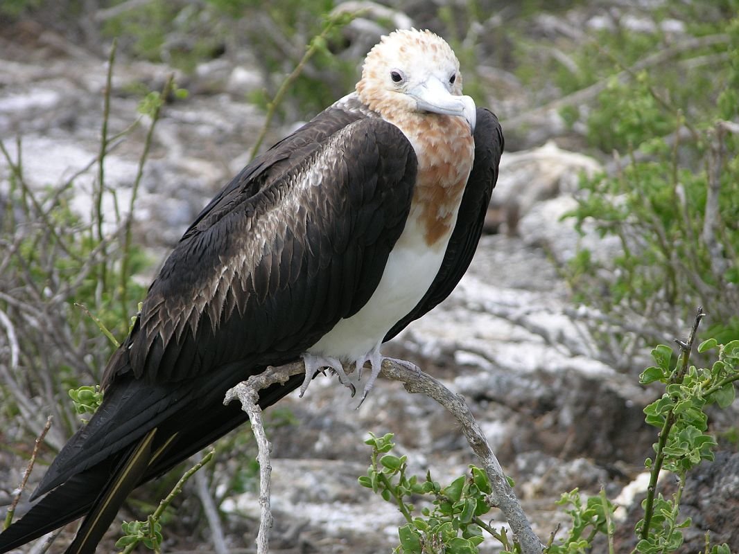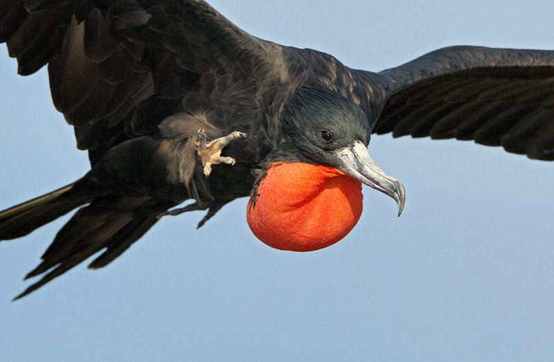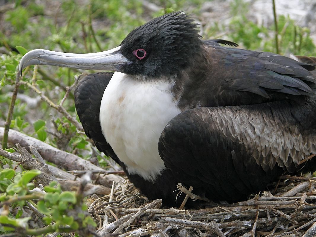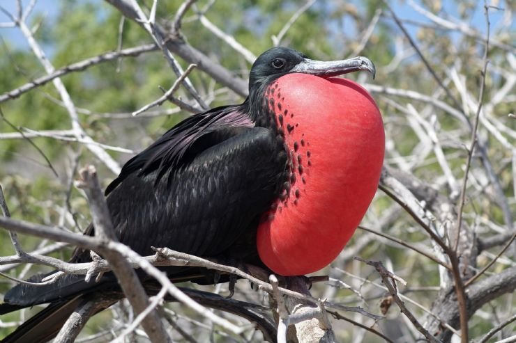 The frigatebird is a large species of sea-bird that has an enormous wingspan that often exceeds two meters in length. Male frigatebirds are most commonly known for their red throat pouch, which are inflated to attract female frigatebirds during the mating season. Frigatebirds are generally black in colour although some frigatebirds look slightly browner than black. Outside of the mating season, male frigatebirds and female frigatebirds can be easily identified due to the fact that the female frigatebird has a white patch on her underside.