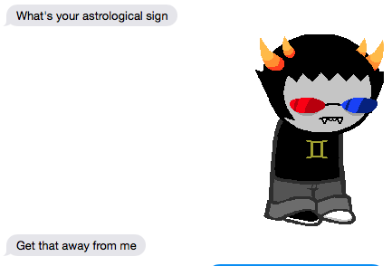 Thanks, and at first I thought your horoscope was your patron troll. Cause I'm a Scorpio but my friend said I was wrong and it was something else, we did the thing and found out its still vriska. Vriska is love, vriska is life